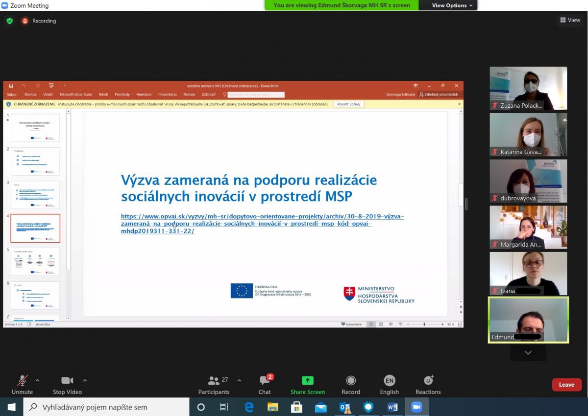 Jedným z hlavných bodov programu bola prezentácia pána Edmunda Škorvagu z MHSR, ktorý zdieľal s účastníkmi svoju negatívnu skúsenosť s Pilotnou výzvou zameranou na podporu realizácie sociálnych inovácií v prostredí malých a stredných podnikov, (MSP). Jednalo sa o financovanie prípravy na realizáciu sociálnej inovácie v praxi.. Z celkových 58 predložených žiadostí prešlo administratívnym a odborným hodnotením 11 žiadostí. Za niektoré z faktorov neúspechu pán Škorvaga spomenul podcenenú prípravu ekosystému na takýto typ podpory, komplikovanosť grantovej podpory z EŠIF aj absenciu iných výziev. Toto bola jediná výzva MHSR v roku 2019.