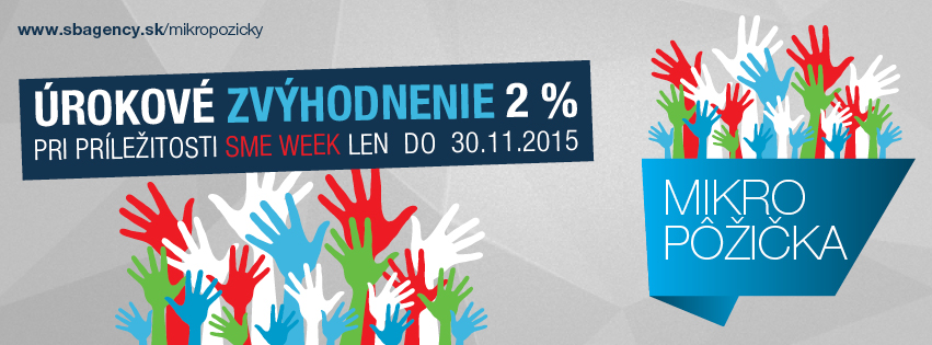 Slovak Business Agency v rámci Európskeho týždňa malého a stredného podnikania (SME Week) ponúka zvýhodnené mikropôžičky. Podnikatelia, ktorí si podajú žiadosť o mikropôžičku od 1.11.2015 do 30.11.2015, môžu získať až 50 000 eur s 2 % úrokovým zvýhodnením a s možnosťou odkladu splátok istiny do 6 mesiacov od čerpania úveru.