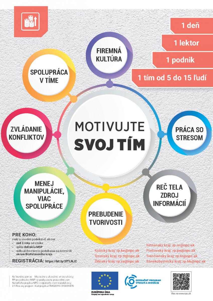 Nefinančná pomoc – Motivačné a aktivačné tímové aktivity RP pre jednotlivé MSP - je poskytovaná podnikateľom nad 3 roky od vzniku, ktorí majú sídlo alebo miesto podnikania na území Slovenskej republiky s výnimkou Bratislavského samosprávneho kraja a je zabezpečená prostredníctvom Národného projektu NPC v regiónoch Operačného programu Výskum a Inovácie, v rámci podaktivity 2.1 Rastový program. Kód projektu ITMS2014+ 313031I870.