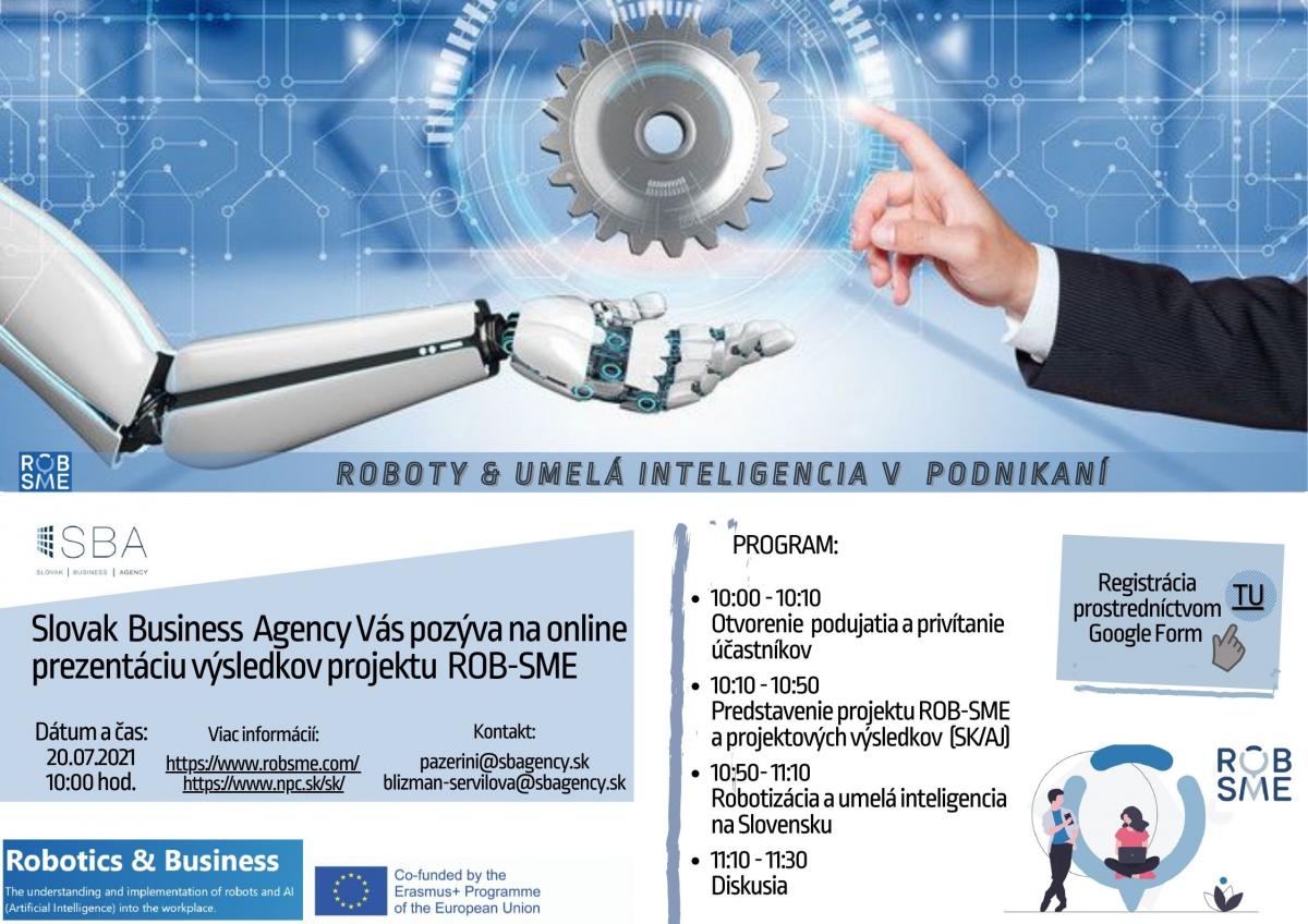 Vývoj nových technológií neustále napreduje a je preto dôležité vedieť, ako tieto technológie využívať vo svoj prospech. O tejto téme sa všetci záujemcovia budú môcť dozvedieť viac prostredníctvom online podujatia, počas ktorého budú prezentované výsledky projektu ROB-SME zameraného práve na tému nových technológií, konkrétne na integráciu robotov a umelej inteligencie do výrobného procesu podnikov.