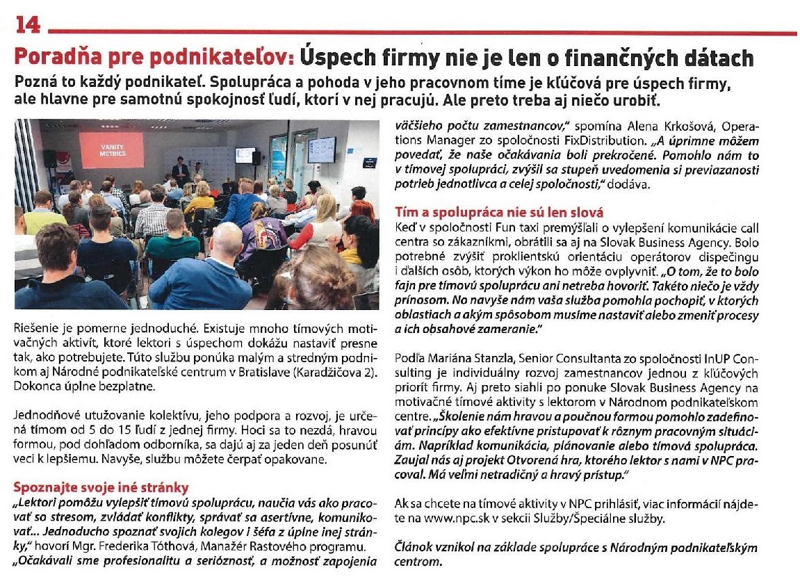 Naša spolupráca s ružinovským časopisom Echo pokračuje. Tentokrát vyspovedali niekoľkých z našich klientov, ktorí sa zúčastnili „Tímových motivačných aktivít“. Je to jedna zo služieb, ktoré NPC bezplatne ponúka firmám a podnikateľom, ktorí hľadajú spôsob ako zlepšiť tímovú spoluprácu a komunikáciu vo svojej firme.
