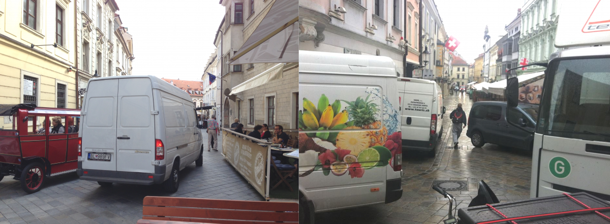 Fotografie ilustrujúce zásobovanie pešej zóny výhradne automobilmi
