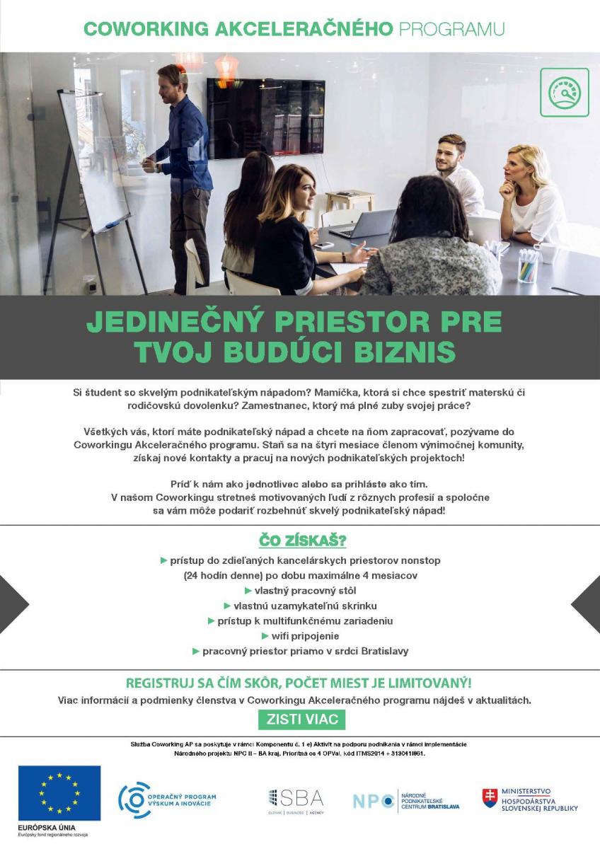Služba Coworking Akceleračného programu je pre nepodnikateľov zabezpečená prostredníctvom Národného projektu NPC II – BA kraj, v rámci podaktivity 1.2 Akceleračný program.
