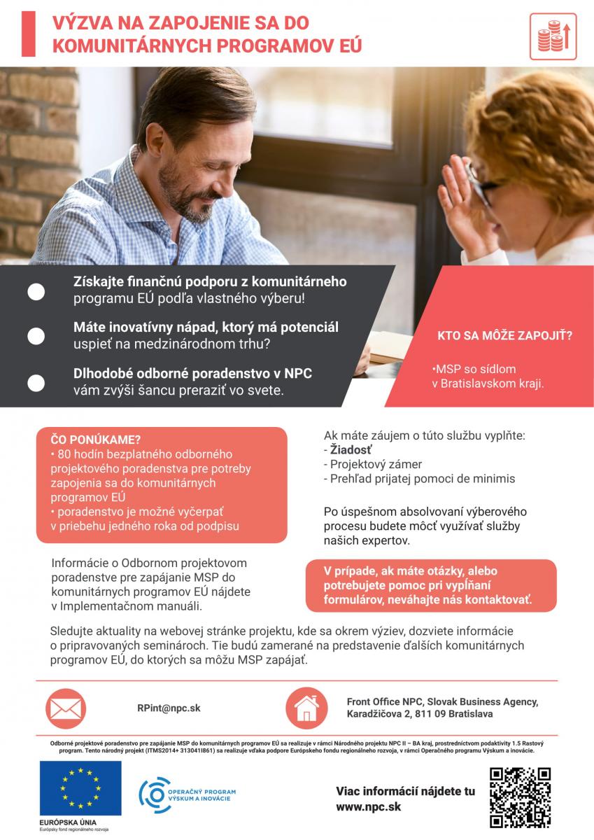 Odborné projektové poradenstvo pre zapájanie MSP do komunitárnych programov EÚ sa realizuje v rámci Národného projektu NPC II – BA kraj, prostredníctvom podaktivity 1.5 Rastový program. Tento národný projekt (ITMS2014+ 313041I861) sa realizuje vďaka podpore Európskeho fondu regionálneho rozvoja, v rámci Operačného programu Výskum a inovácie.